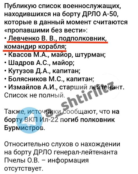 Вместе с российским самолетом А-50 был ликвидирован командир воздушного судна подполковник Вячеслав Левченко. О гибели Левченко пишет в своем телеграм-канале полковник ВСУ Анатолий Штефан, "Штирлиц".
