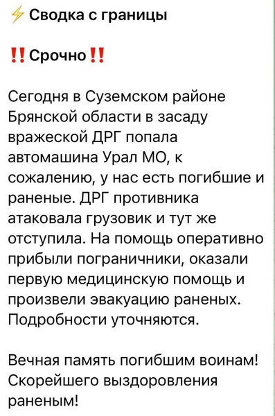 "В Суземском районе Брянской области в засаду украинской ДРГ попала автомашина "Урал" МО РФ. К сожалению, у нас есть погибшие и раненые. ДРГ противника атаковала грузовик и тут же отступила. На помощь пришли пограничники, оказали первую медицинскую помощь и эвакуировали раненых", — говорится в сообщении.
