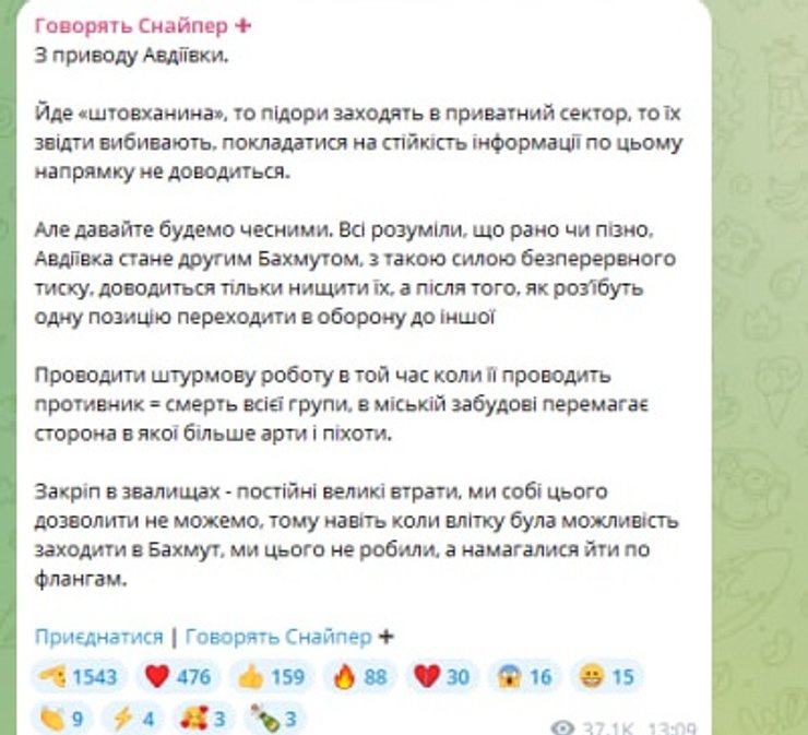 "Идет "толкотня", то пид**ы заходят в частный сектор, то их оттуда выбивают, полагаться на устойчивость информации по этому направлению не приходится. Но давайте будем честными. Все понимали, что рано или поздно, Авдеевка станет вторым Бахмутом, с такой силой непрерывного давления, приходится только уничтожать их, а после того, как раз**ут одну позицию переходить в оборону к другой", — рассказал он.