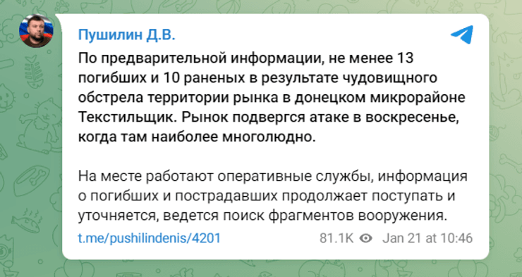 Утром 21 января под обстрелом оказался жилой микрорайон Текстильщик в Кировском районе Донецка. В оккупационных властях заявляют о большом количестве раненых и погибших. Об этом написал так называемый глава оккупационной администрации Донецкой области Денис Пушилин.