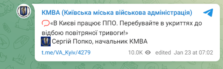 Также в 7:02 в Киевской городской военной администрации (КГВА) сообщили об активной работе ПВО в столице.