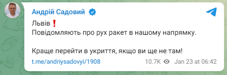 В 6:42 мэр Львова Андрей Садовый сообщил о движении ракет в направлении области.