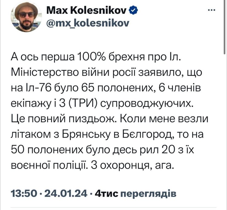 "А вот первая 100% ложь об Ил-76. Министерство войны России заявило, что на Ил-76 было 65 пленных, 6 членов экипажа и 3 (ТРИ) сопровождающих. Это полный п**дьож. Когда меня везли самолетом из Брянска в Белгород, то на 50 пленных было где-то рыл 20 из их военной полиции. 3 охранника, ага", — отметил он.