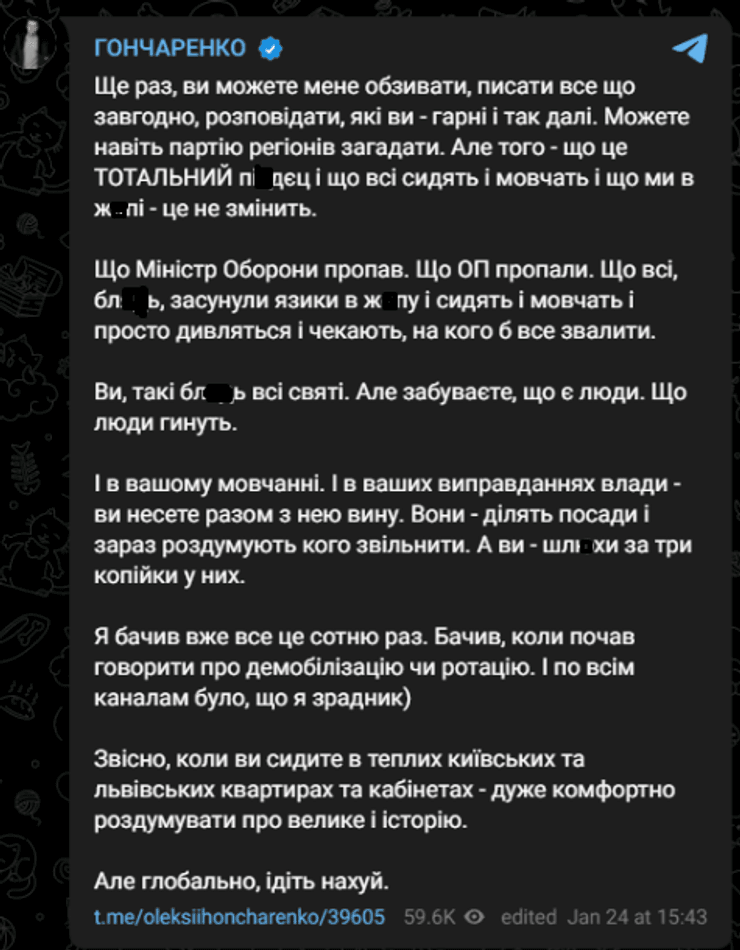 "Еще раз, вы можете меня обзывать, писать все что угодно, рассказывать, какие вы — хорошие и так далее. Можете даже партию регионов загадать. Но того — что это тотальный п#здец и что все сидят и молчат и что мы в ж#пе — это не изменит. Что министр обороны пропал. Что ОП пропали. Что все, бл#дь, засунули языки в ж#пу и сидят и молчат и просто смотрят и ждут, на кого бы все свалить. Вы, такие бл#дь все святые. Но забываете, что есть люди. Что люди гибнут", — написал Гончаренко.
