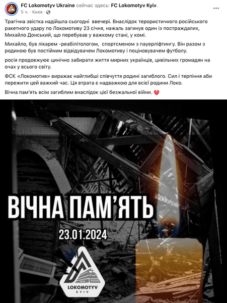 Ракетный удар по киевскому спортивному комплексу "Локомотив", который произошел утром 23 января, унес жизнь еще одного человека — Михаила Донского. Об этом 26 января сообщил футбольный клуб "Локомотив" на своей странице в Facebook.