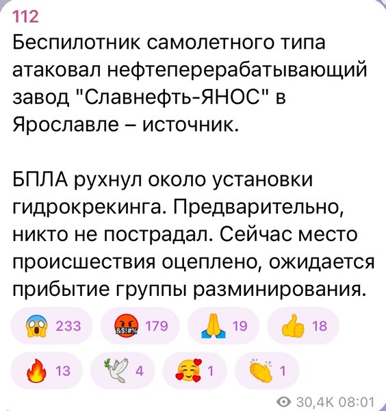 Беспилотник атаковал крупнейший нефтеперерабатывающий завод Северного региона России, расположенный в Ярославле. Об этом 29 января сообщили в российском Telegram-канале Baza.