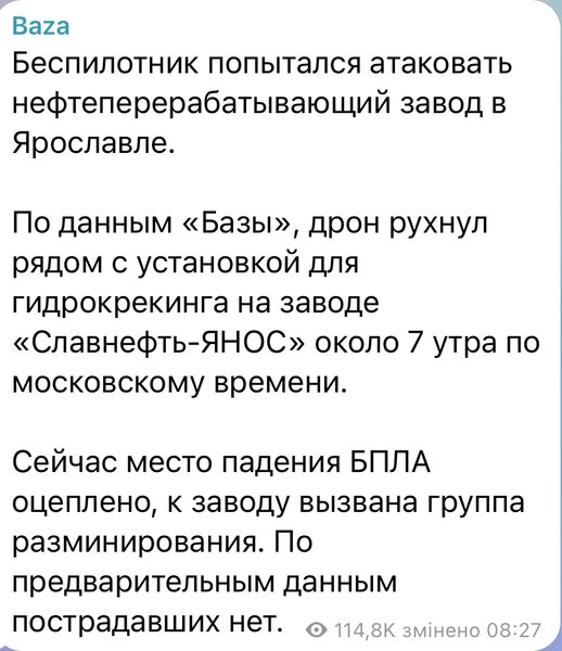 По данным администраторов канала, дрон рухнул рядом с установкой для гидрокрекинга на заводе "Славнефть-ЯНОС" около 7 утра по московскому времени.