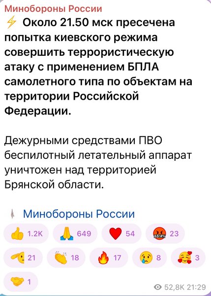 В Министерстве обороны России заявили, что около 21:50 по московскому времени БПЛА якобы атаковали объекты на территории Российской Федерации.