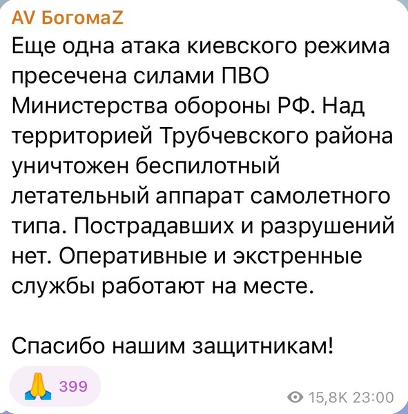 Через два часа после первого заявления, Богомаз сообщил о еще одной атаке дронов. На этот раз, по его словам, российские войска ликвидировали беспилотник над территорией Трубчевского района. Пострадавших и разрушений также нет, на месте происшествия работали соответствующие службы.