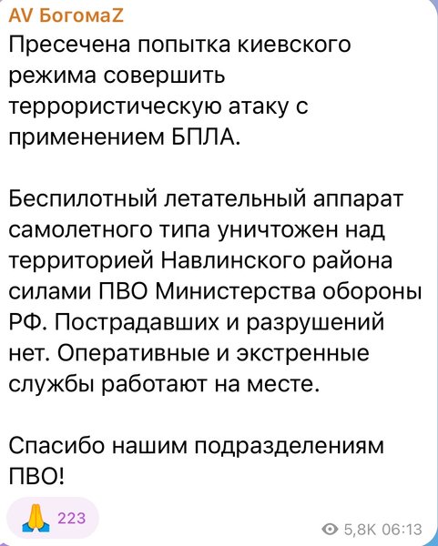 По словам губернатора региона Александра Богомаза, ПВО якобы работала в Жуковском, Трубчевском и Навлинском районах. Пострадавших и разрушений нет.