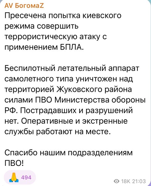 Вечером в понедельник, 29 января, Богомаз заявил о первой атаке БПЛА. По его словам, силы ПВО Министерства обороны Российской Федерации якобы уничтожили беспилотный летательный аппарат самолетного типа над территорией Жуковского района.