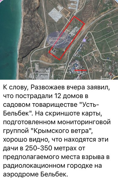 "На скриншоте карты, подготовленной мониторинговой группой "Крымского ветра", хорошо видно, что эти дачи находятся в 250-350 метрах от предполагаемого места взрыва в радиолокационном городке на аэродроме Бельбек", — говорится в сообщении.