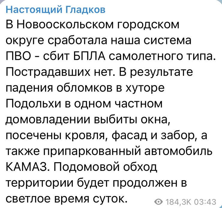 Глава Белгородской области Вячеслав Гладков также сообщил о сбитом беспилотнике в своем регионе. По его данным, пострадавших нет, в результате падения обломков в одном доме выбило окна, повреждены кровля, фасад и забор, а также припаркованный КАМАЗ.
