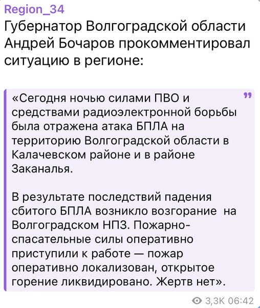 На момент написания материала украинская сторона официально не сообщила об ударах по объектам в Российской Федерации, в частности не комментировали и пожар на НПЗ в Волгограде.