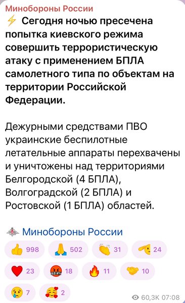 Как уверяют в Минобороны РФ, противовоздушная оборона Российской Федерации сбила в ночь на субботу четыре беспилотника, один — в Белгородской области, еще два — в Волгоградской и один — в Ростовской.