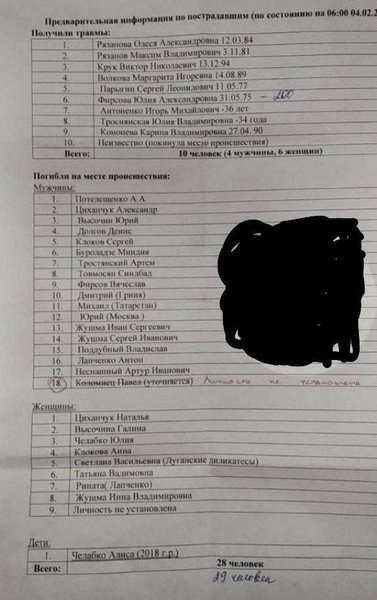 В Telegram-каналах начали публиковать список погибших. В нем жители Лисичанска нашли фамилию владельца заведения — местного бизнесмена, который имел в Лисичанске еще и магазины, а также человека, который работал в оккупационной "налоговой".