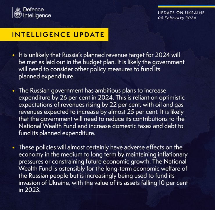 Маловероятно, что запланированный целевой показатель доходов Российской Федерации на 2024 год будет достигнут, как заложено в бюджетном плане. Это может потребовать от правительства рассмотрения других политических мер для обеспечения финансирования запланированных расходов. Об этом говорится в отчете разведки Министерства обороны Великобритании от 5 февраля.