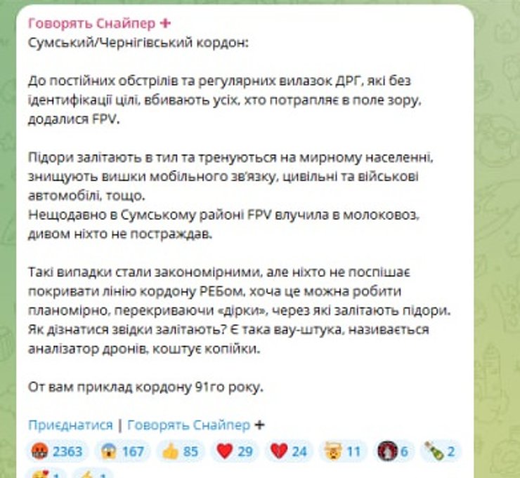 "К постоянным обстрелам и регулярным вылазкам ДРГ, которые без идентификации цели, убивают всех, кто попадает в поле зрения, добавились FPV. П**оры залетают в тыл и тренируются на мирном населении, уничтожают вышки мобильной связи, гражданские и военные автомобили и тому подобное. Недавно в Сумском районе FPV попала в молоковоз, чудом никто не пострадал", — рассказал он.