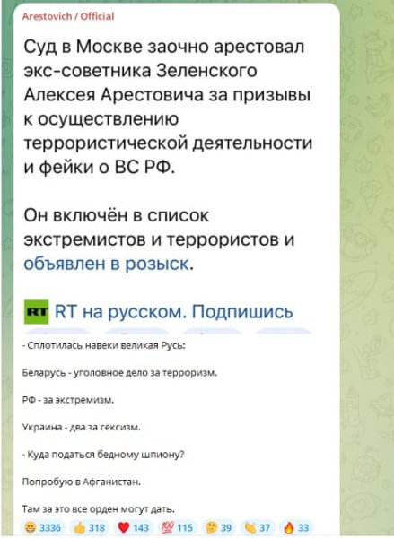 Отмечается, что Басманный суд Москвы заочно арестовал Алексея Арестовича за "фейки" о ВС РФ и призывы к терроризму. В октябре МВД России объявило Арестовича в розыск, а в мае 2023 года Росфинмониторинг внес его в список "террористов и экстремистов". В самопровозглашенной так называемой "ДНР" в сентябре 2022 года против политика возбудили уголовное дело о призывах к экстремистской деятельности.