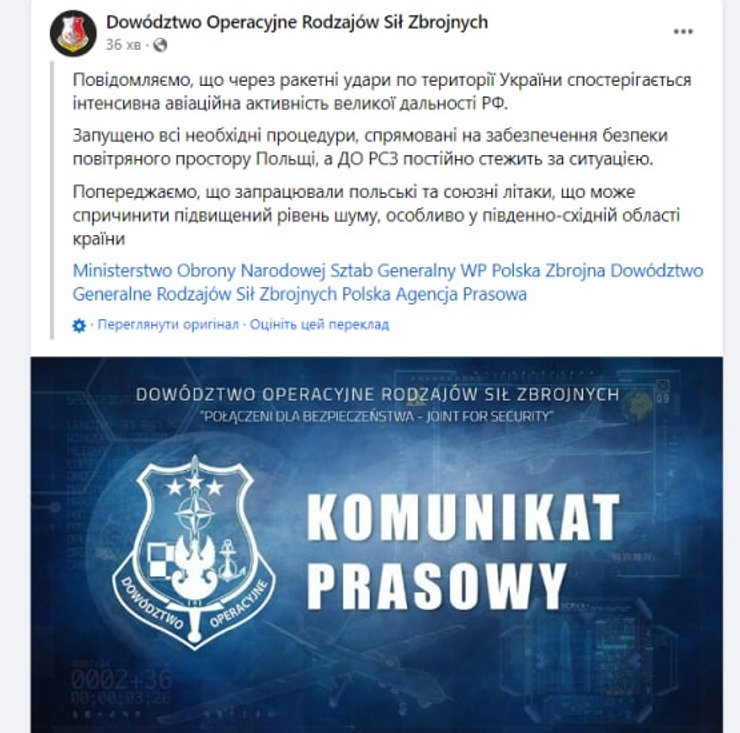 Российская ракета недавно уже залетала вглубь территории Польши на 40 километров, поэтому польская армия на этот раз с целью защиты воздушного пространства активизировала авиацию.