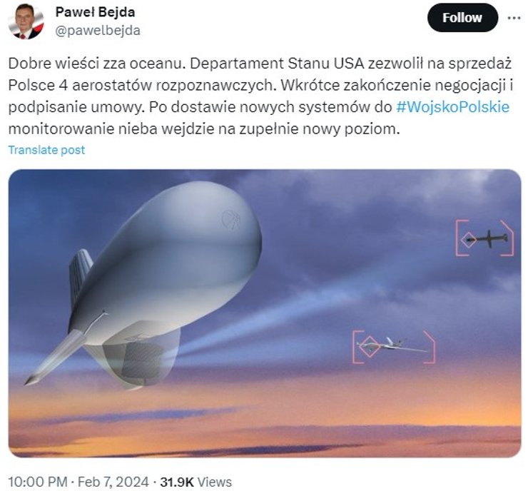 Секретарь Министерства обороны Польши Павел Бейда сообщил в соцсетях о завершении переговоров с Госдепартаментом США по поводу продажи четырех разведывательных аэростатов. Стоимость закупки оборудования, включая логистический пакет, оценивается американцами в 1,2 млрд долларов. О деталях сделки рассказали 7 февраля обозреватели WP Tech.