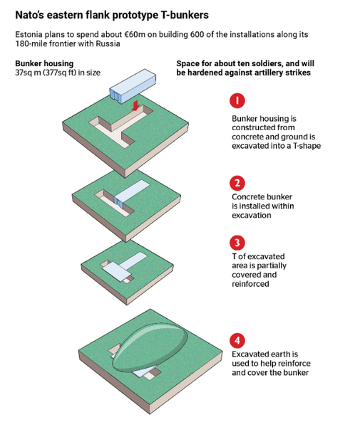 "Каждый бункер будет иметь площадь около 37 кв. м, в нем смогут разместиться около 10 солдат, и он будет защищен от артиллерийских ударов. Кроме того, поблизости будут находиться склады с боеприпасами и такие сооружения, как противотанковые мины, рвы, колючая проволока и бетонные пирамиды, известные как "зубы дракона", — уточнил заместителя министра обороны Эстонии Сюзан Лиллевали.