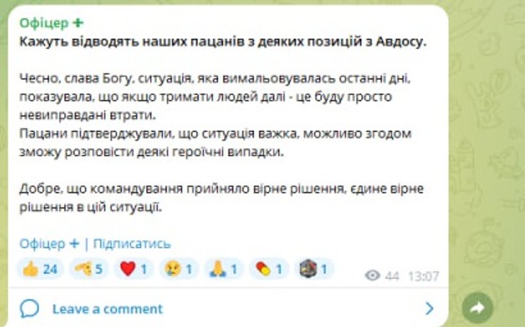 "Говорят отводят наших пацанов с некоторых позиций из Авдоса. Честно, слава Богу, ситуация, которая вырисовывалась последние дни, показывала, что если держать людей дальше — это будут просто неоправданные потери. Пацаны подтверждали, что ситуация тяжелая, возможно впоследствии смогу рассказать некоторые героические случаи. Хорошо, что командование приняло верное решение, единственно верное решение в этой ситуации", — пишет в своем телеграмм-канале "Офицер+" военнослужащий ВСУ с позывным "Алекс".