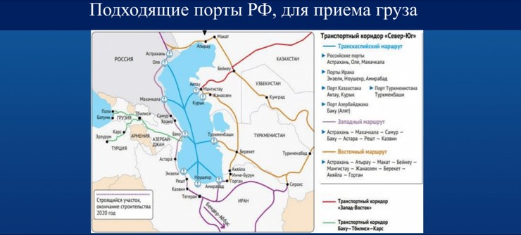 - транскаспийский маршрут предусматривает активное использование морских перевозок через Каспийское море с привлечением российских, иранских, казахских, туркменских и азербайджанских портов;