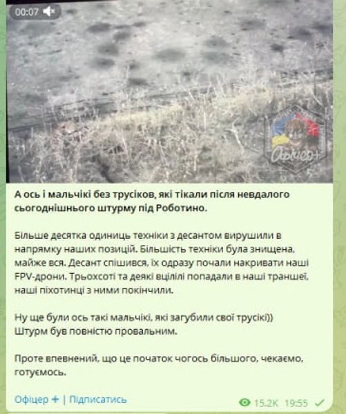 "А вот и мальчики без трусиков, которые убегали после неудачного сегодняшнего штурма под Работино. Более десятка единиц техники с десантом отправились в направлении наших позиций. Большинство техники было уничтожено, почти вся. Десант спешился, их сразу начали накрывать наши FPV-дроны. Трехсотые и некоторые уцелевшие попадали в наши траншеи, наши пехотинцы с ними покончили. Штурм был полностью провальным", — написал он.