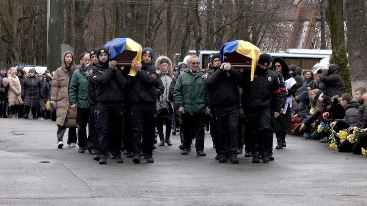 Прощались с защитниками в Церкви Воскресения Христова. В последний путь пришли провести героев родные, знакомые, друзья, одноклассники, побратимы, полицейские и горожане. Среди них классная руководительница защитника Артема Иванишина — Нина Чмиль. По ее словам, что по паспорту имя защитника — Артур, но в жизни парень всегда называл себя Артемом, поскольку это имя нравилось больше.