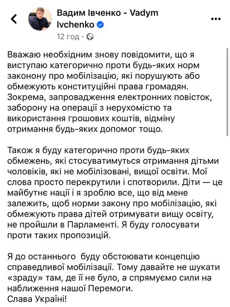 Народный депутат от "Батькивщины" Вадим Ивченко, который ранее предложил отказывать в услугах детям людей, которые уклоняются от мобилизации и не стоят на воинском учете, заявил, что его слова "перекрутили и исказили". Об этом он написал в своем Facebook.