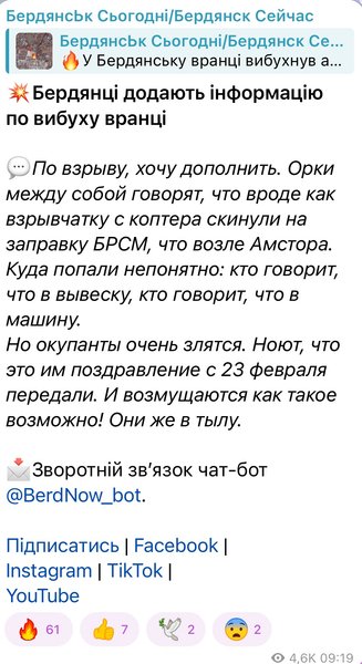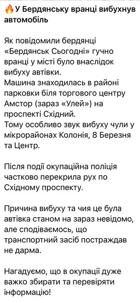 Оккупационные медиа пробуют продвигать свою версию взрыва. По информации "Лента новостей Бердянска" со ссылкой на данные экстренных служб, взрыв произошел на одной из АЗС города якобы во время проведения "регламентно-технических работ" и в результате "неосторожного обращения с легковоспламеняющимися веществами".