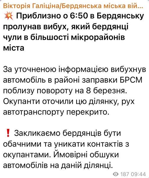 В оккупированном Бердянске Запорожской области утром 22 февраля было шумно. Вблизи заправки взорвался автомобиль. Об этом сообщила глава Бердянской городской военной администрации Виктория Галицина.