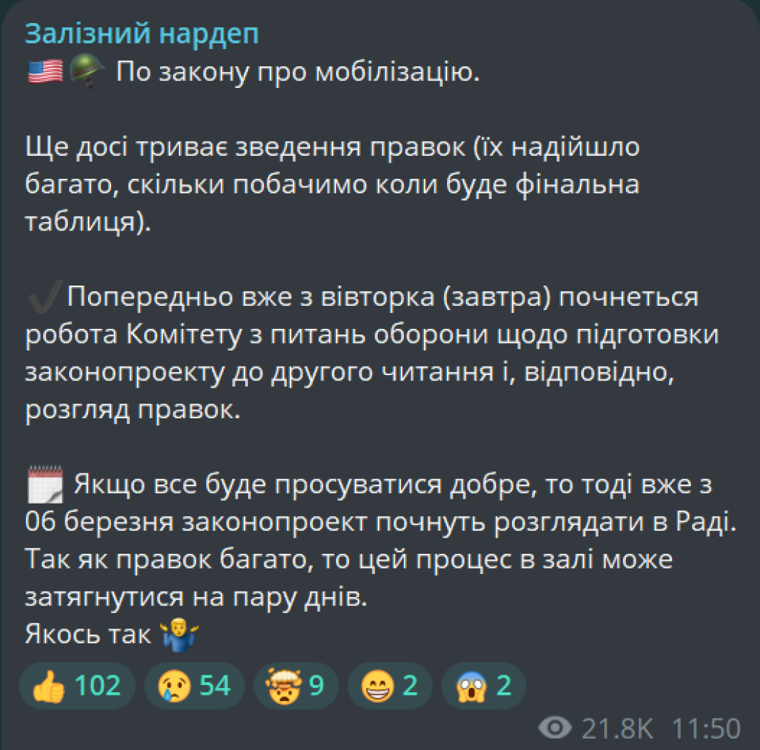 Надеп заявил, что начиная со вторника, 27 февраля, Комитет по вопросам национальной безопасности, обороны и разведки начнет работу над подготовкой законопроекта к второму чтению, а также рассмотрение внесенных поправок. Согласно уточненным данным, всего поступило 4195 поправок, из которых 40 представлены самим Железняком.