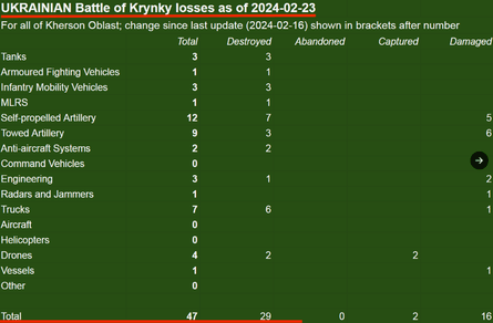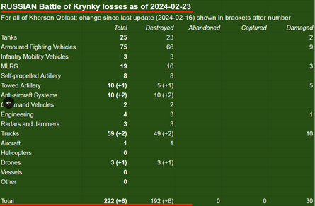 С октября 2023 года, как подтверждают данные OSINT-аналитика Naalsio, россияне потеряли 222 машины, пытаясь вернуть Крынки, в том числе раритетные танки Т-62, которые Кремль вывел из долгосрочного хранения, чтобы восстановить хотя бы частично 2600 танков, потерянные в Украине. Украинцы же, дополняет корреспондент Forbes, потеряли всего 47 транспортных средств, удерживая Крынки.