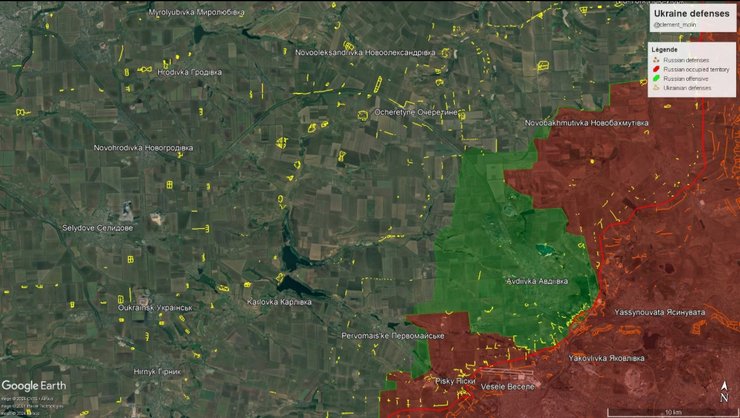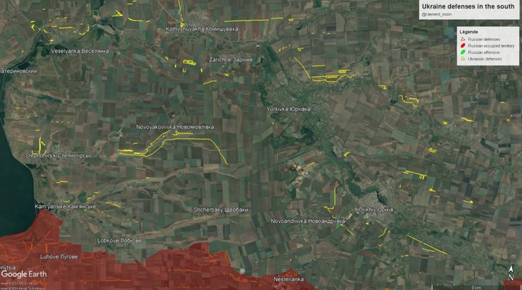 Osint-аналитик Clément Molin из Франции написал в своем аккаунте в X (бывший Twitter), что Украина, "сталкиваясь с трудностями на фронте", копает огромные укрепления по всей территории Донбасса и Запорожской области.