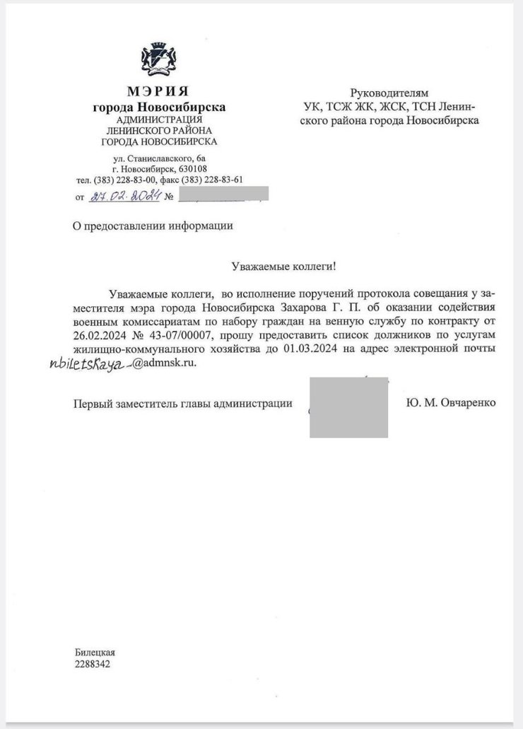 В Новосибирске глава Ленинского района направил управляющим компаниям письмо с просьбой предоставить информацию о должниках по ЖКХ. Данные якобы необходимы для "содействия военным комиссариатам".