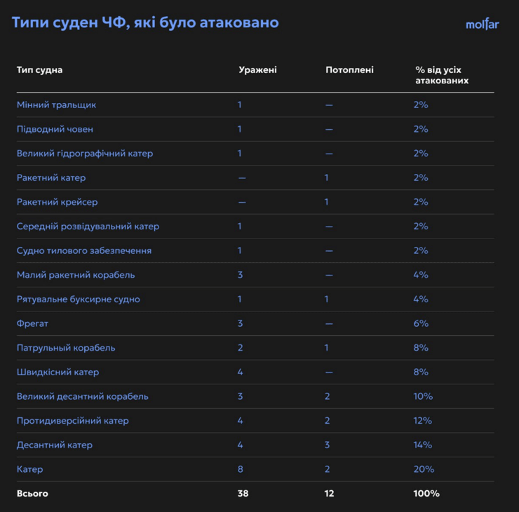 Всего зафиксировали 184 военных кораблей Черноморского флота РФ. Поражена 51 единица, что составляет примерно 21% от общего числа. Из них 12 кораблей были полностью потоплены, что составляет 23,5% от всех поражений. Особенно среди пораженных судов можно выделить катера различного назначения — 19 единиц, из которых 8 были потоплены.