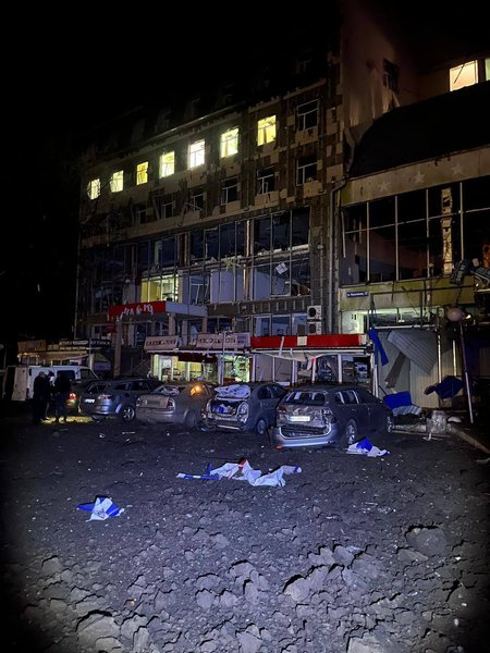 "В результате обстрела выбиты окна в 9-этажном жилом доме. Поврежден фасад ТРЦ, банка, магазина, гостиницы, 13 автомобилей", — сказал он.