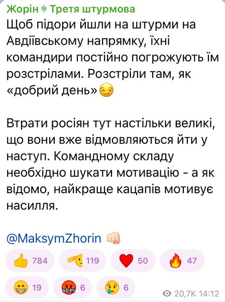 Российский командный состав "мотивирует" своих военных участвовать в штурмах на Авдеевском направлении с помощью угроз о расстреле. Об этом сообщает заместитель командира 3-й Отдельной штурмовой бригады Максим Жорин в своем Telegram 6 марта.