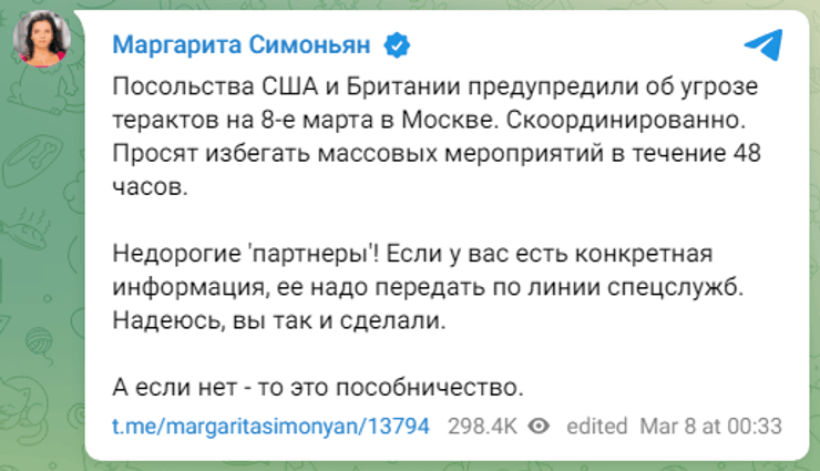 Отметим, что официально Кремль не комментировал предупреждения стран Запада, при этом главред пропагандистского телеканала RT Маргарита Симоньян отреагировала на предупреждения о терактах в своем Telegram.