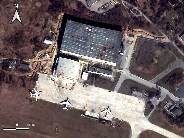 Также в посте был приложен спутниковый снимок с последствиями удара по территории предприятия. На кадре можно заметить три самолета и ангар, который получил повреждения.