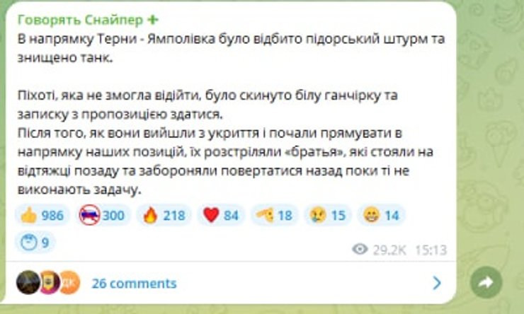 "В направлении Терны — Ямполовка был отбит п**орский штурм и уничтожен танк. Пехоте, которая не смогла отойти, было сброшено белую тряпку и записку с предложением сдаться. После того, как они вышли из укрытия и начали двигаться в направлении наших позиций, их расстреляли "братья", — рассказал Бунятов.