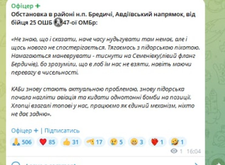 "Не знаю, что и сказать, как будто времени скучать там нет, но и что-то нового не наблюдается. Тягаемся с п**орской пехотой. Пытаются маневрировать — давить на Семеновку (левый фланг Бердичев), потому что поняли, что в лоб им нас не взять, даже имея преимущество в численности", — рассказал боец.