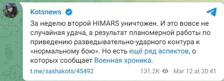 Министерство обороны РФ 12 марта бравурно сообщило об уничтожении на фронте украинской РСЗО М142 HIMARS, опубликовав соответствующее видео из беспилотника. Однако обозреватели Bulgarian Military при просмотре видеоролика отметили, что между установкой и местом взрыва можно увидеть заметно большое пространство, поэтому о полном уничтожении HIMARS не может быть и речи.