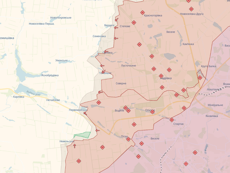Возле Невельского ситуация ухудшилась также, но село контролируют Силы Обороны. На прошлой неделе враг имел успех в Первомайском, выровняв линию соприкосновения. Враг проводит серию массовых атак возле Георгиевки и в самом селе, а также в Новомихайловке. В последней имеет успех и пытается его развить, не считаясь ни с какими потерями.