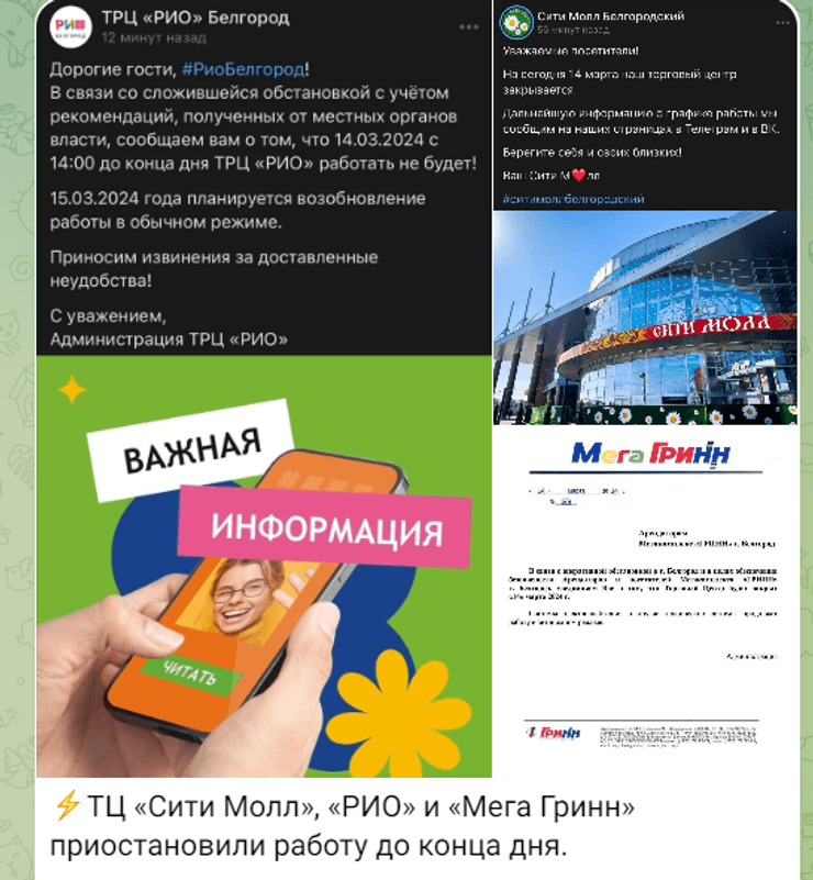 Российские СМИ распространили сообщения ряда ТЦ. В частности закрылись "МегаГринн", "СитиМолл" и "Рио". В последнем заявили, что решение прекратить работу приняли на основе "рекомендаций" местных властей.