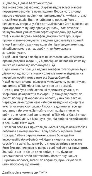 "Через несколько часов мне набирает неизвестный номер и я слышу голос моего парня, который просит помощи, и все, это последний раз я его слышу. Конечно, после полиция ничего не делает, но говорит мне, что теперь он в ТЦК города Хуст. И только на следующий день в 8 утра я слышу от добрых людей, что он в реанимации города Хуст", — рассказывает автор.