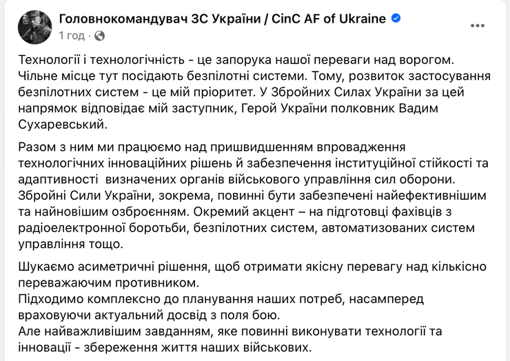 Главнокомандующий ВСУ Александр Сырский заявил, что технологии и технологичность — это залог победы над россиянами. Об этом он сообщил в своем Facebook.