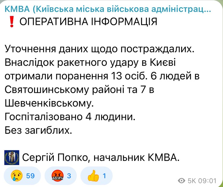 Во время и после ударов российских оккупантов столичная власть сообщала о количестве пострадавших. Однако, по уточненным данным Попко, по состоянию на 09:00 известно, что ранения получили 13 человек. В Святошинском районе — 6 человек, а в Шевченковском — 7.